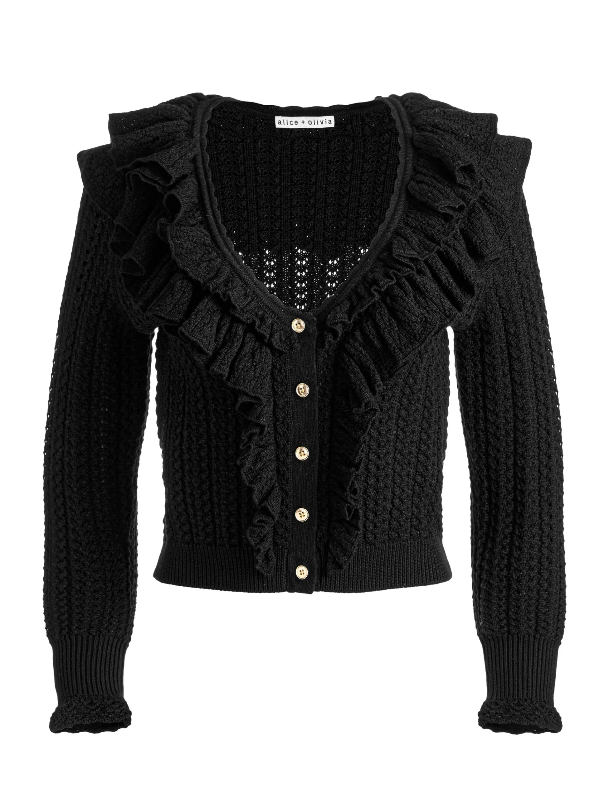 - Ruffled neckline and placket