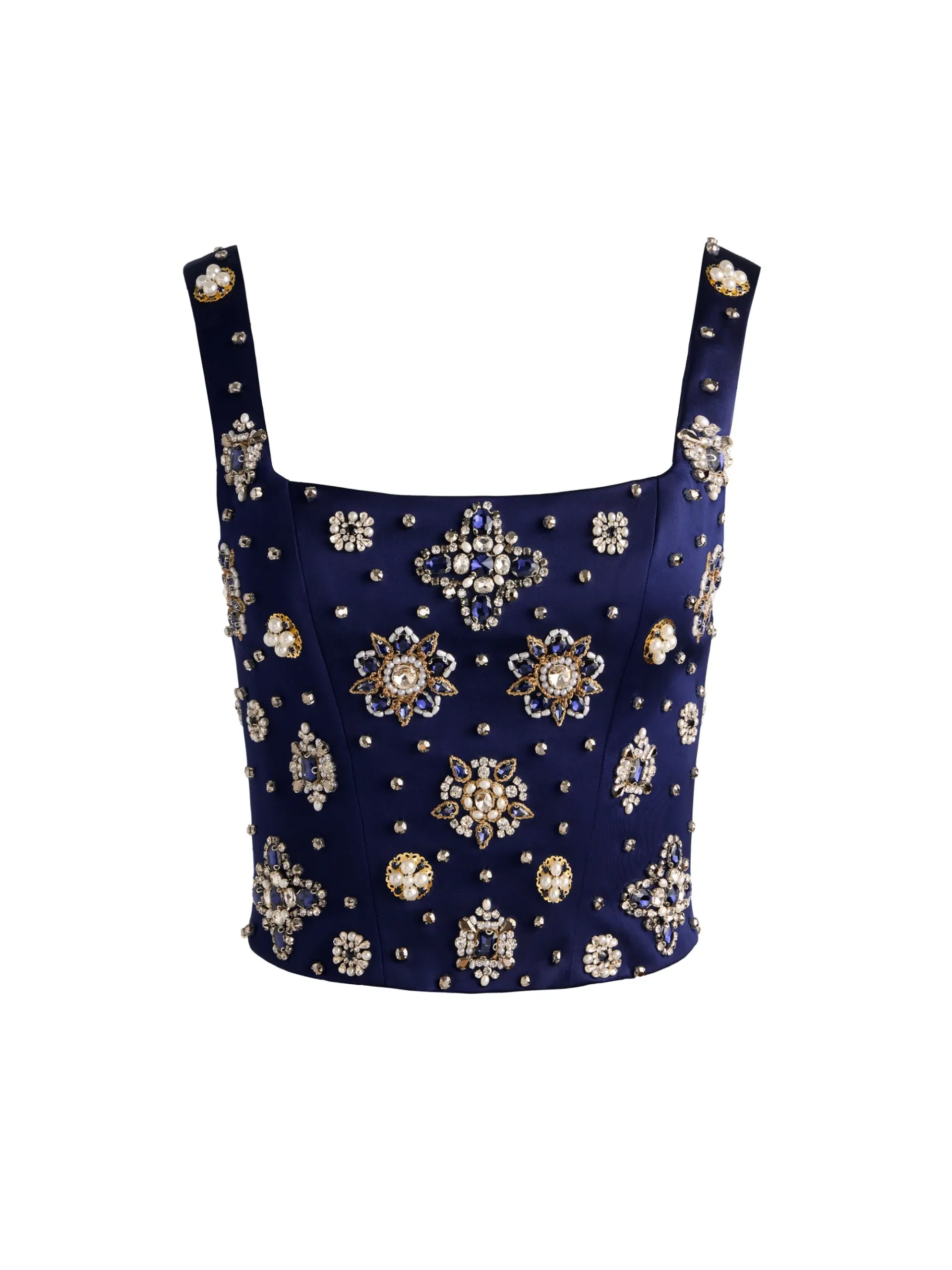 - Crystal and pearl embellishments