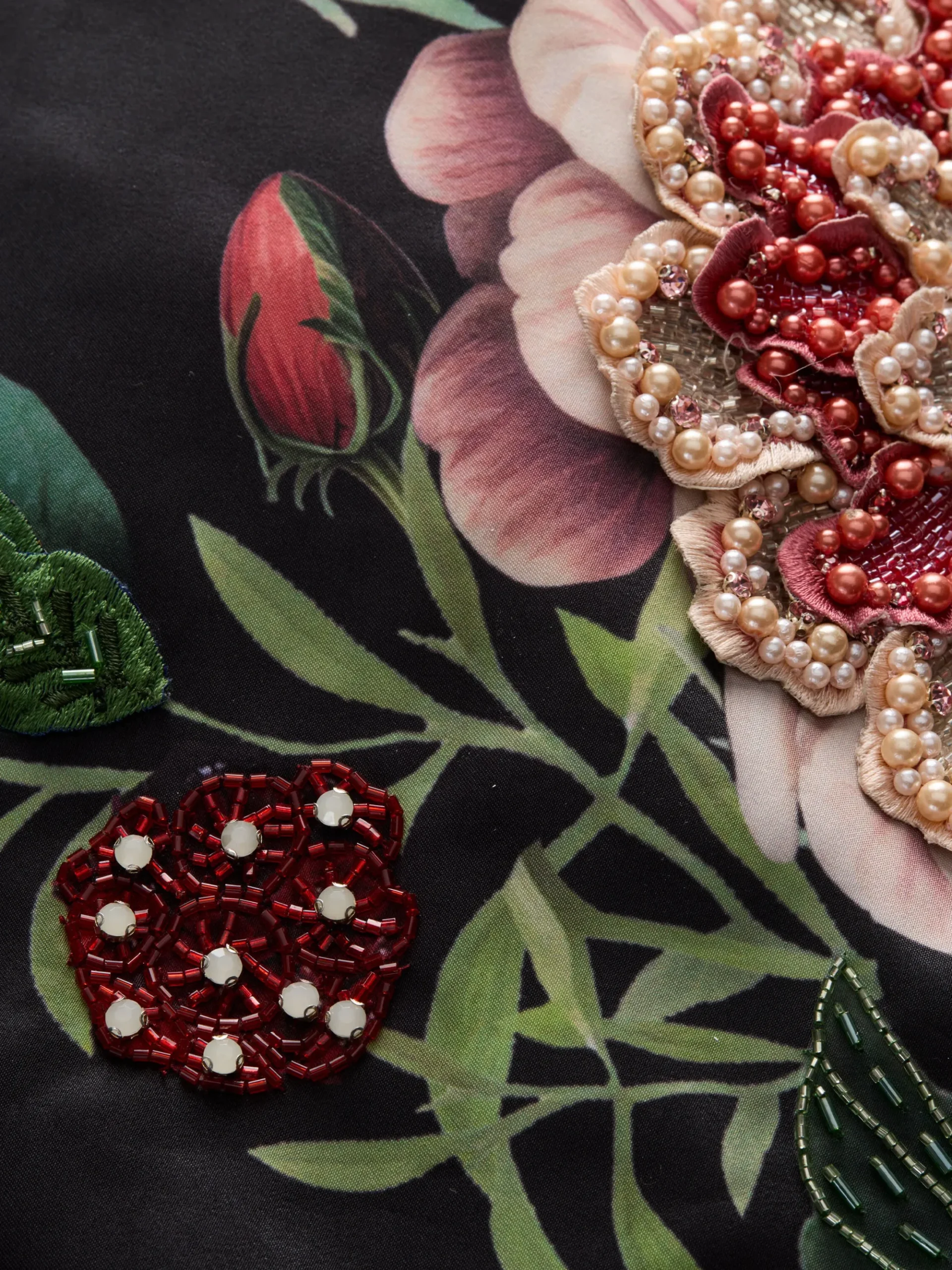 - 3D embellished floral and vine motifs on satin base